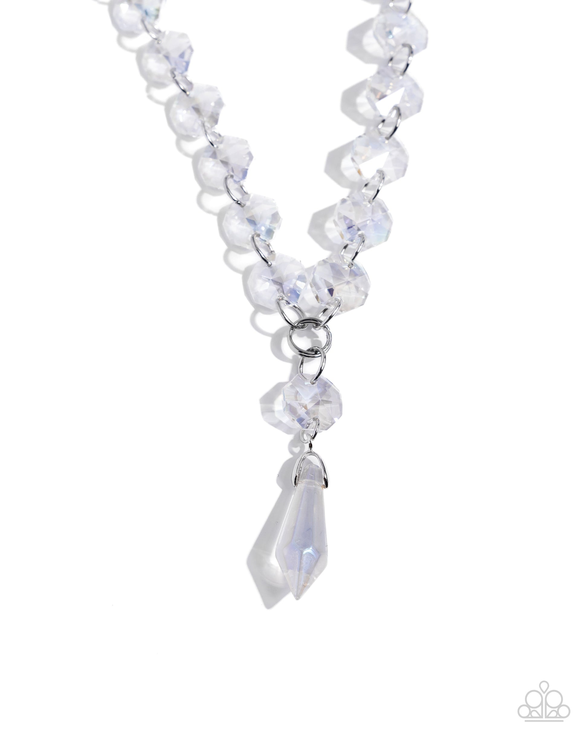 Featuring an opalescent, UV shimmer, faceted white beads flicker and flash along a silver chain as it extends below the neckline, leading the eye to a faceted, prismatic bead for a finishing touch of shimmer. Features an adjustable clasp closure. Due to its prismatic palette, color may vary.