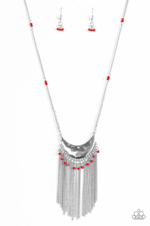 A delicately hammered silver crescent swings from the bottom of an elongated silver chain infused with red seed bead accents. The tribal inspired pendant gives way to a shimmery fringe sprinkled with more seed beads for a wanderlust finish. Features an adjustable clasp closure.
