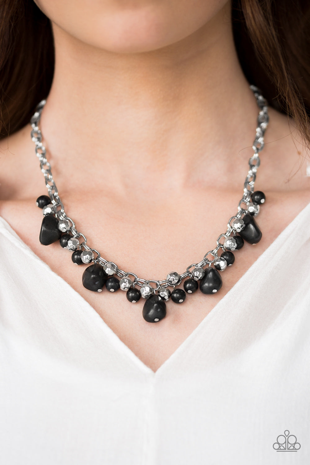 Featuring round and asymmetrical cuts, refreshing black stones trickle from the bottom of a double chain-linked chain. Faceted silver beads trickle between the stones, adding a splash of metallic shimmer to the earthy fringe. Features an adjustable clasp closure.