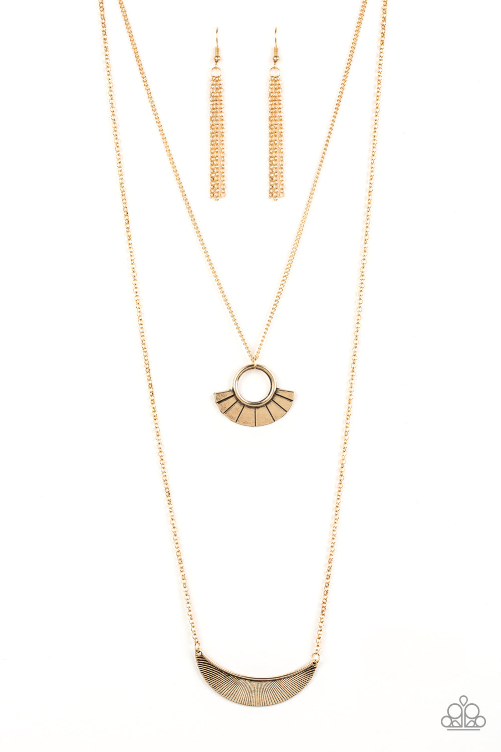 Radiating with linear patterns, a flared gold frame swings above a gold half-moon frame, creating tribal inspired layers below the collar. Features an adjustable clasp closure.