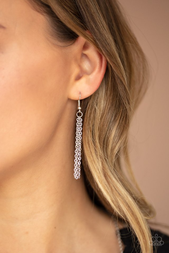 A white rhinestone encrusted ring, oval red rhinestone, and shimmery silver chain tassel dangles from the bottom of a lengthened silver chain, creating a glamorous statement. Features an adjustable clasp closure. Sold as one individual necklace. Includes one pair of matching earrings. Get The Complete Look! Bracelet: "Glamorous Glow - Red" (Sold Separately)